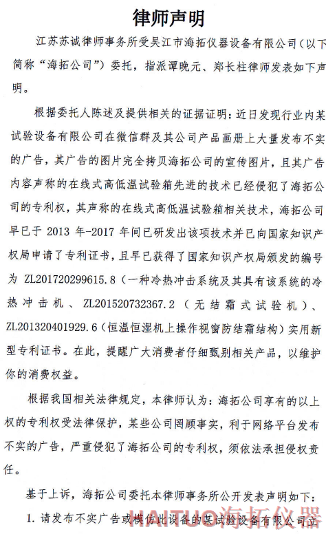 海拓儀器律師聲明:反對(duì)侵權(quán)行為 維護(hù)公司和消費(fèi)者權(quán)益摘要:國(guó)內(nèi)試驗(yàn)設(shè)備領(lǐng)先者吳江市海拓儀器設(shè)備有限公司委托律師事務(wù)所發(fā)布了律師聲明,該聲明指出,當(dāng)前市面上出現(xiàn)了產(chǎn)品專利侵犯海拓儀器權(quán)益,海拓儀器將以法律手段維護(hù)自身利益。該律師聲明要求某試驗(yàn)設(shè)備有限公司立即停止侵權(quán)行為,扯下其在網(wǎng)絡(luò)平臺(tái)的相關(guān)廣告和宣傳畫(huà)冊(cè)并同時(shí)停止生產(chǎn)同款設(shè)備。如果該設(shè)備公司不聽(tīng)勸解,海拓儀器將向人民法院依法起訴該公司侵權(quán)行為,以維護(hù)自身合法權(quán)益和維護(hù)客戶消費(fèi)權(quán)益,并建議廣大消費(fèi)者仔細(xì)甄別相關(guān)產(chǎn)品。? ? ? ?近日,吳江市海拓儀器設(shè)備有限公司委托律師事務(wù)所發(fā)布了律師聲明,該聲明指出,當(dāng)前市面上出現(xiàn)了產(chǎn)品專利侵犯海拓儀器權(quán)益,海拓儀器將以法律手段維護(hù)自身利益。??事件源起于海拓儀器發(fā)現(xiàn)市面上有同類設(shè)備公司通過(guò)完全拷貝海拓儀器產(chǎn)品宣傳圖片,在微信群及該公司產(chǎn)品畫(huà)冊(cè)上大量發(fā)布不實(shí)廣告。??聲明指出,該廣告聲稱的在線式高低溫試驗(yàn)箱的技術(shù)侵犯了海拓儀器的專利權(quán),該產(chǎn)品專利由海拓儀器 -