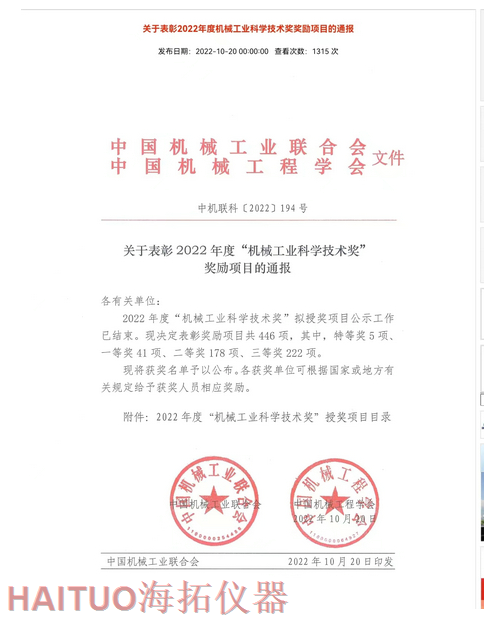 海拓儀器榮獲2022年度中國(guó)機(jī)械工業(yè)科學(xué)技術(shù)獎(jiǎng)?ICC訊?10月20日,2022年度“中國(guó)機(jī)械工業(yè)科學(xué)技術(shù)獎(jiǎng)”項(xiàng)目名錄正式發(fā)布,由海拓儀器(江蘇)有限公司完成的“超快速冷熱沖擊試驗(yàn)系統(tǒng)關(guān)鍵技術(shù)研究與系列應(yīng)用”項(xiàng)目榮獲2022年度“中國(guó)機(jī)械工業(yè)科學(xué)技術(shù)獎(jiǎng)”三等獎(jiǎng)。??據(jù)了解,中國(guó)機(jī)械工業(yè)科學(xué)技術(shù)獎(jiǎng)是根據(jù)《國(guó)家科學(xué)技術(shù)獎(jiǎng)勵(lì)條例》和《社會(huì)力量設(shè)立科學(xué)技術(shù)獎(jiǎng)管理辦法》的有關(guān)規(guī)定,由中國(guó)機(jī)械工業(yè)聯(lián)合會(huì)和中國(guó)機(jī)械工程學(xué)會(huì)共同設(shè)立并經(jīng)國(guó)家科學(xué)技術(shù)部批準(zhǔn),在國(guó)家科技獎(jiǎng)勵(lì)主管部門(mén)登記的面向全國(guó)機(jī)械行業(yè)的綜合性科技獎(jiǎng)項(xiàng)。旨在表彰在機(jī)械工業(yè)科技工作中作出突出貢獻(xiàn)的單位和人員,獎(jiǎng)勵(lì)范圍包括:機(jī)械工業(yè)科學(xué)技術(shù)發(fā)明成果、機(jī)械工業(yè)科學(xué)技術(shù)進(jìn)步成果、機(jī)械工業(yè)工程化和新技術(shù)推廣成果和機(jī)械工業(yè)軟科學(xué)和標(biāo)準(zhǔn)成果。??海拓儀器是一家集研發(fā)、制造、貿(mào)易于一體高科技現(xiàn)代化公司,公司成立于2005年,主要產(chǎn)品包括:超快速冷熱沖擊試驗(yàn)機(jī)(熱流儀)、快速溫變應(yīng)力篩選試驗(yàn)箱(ESS), -